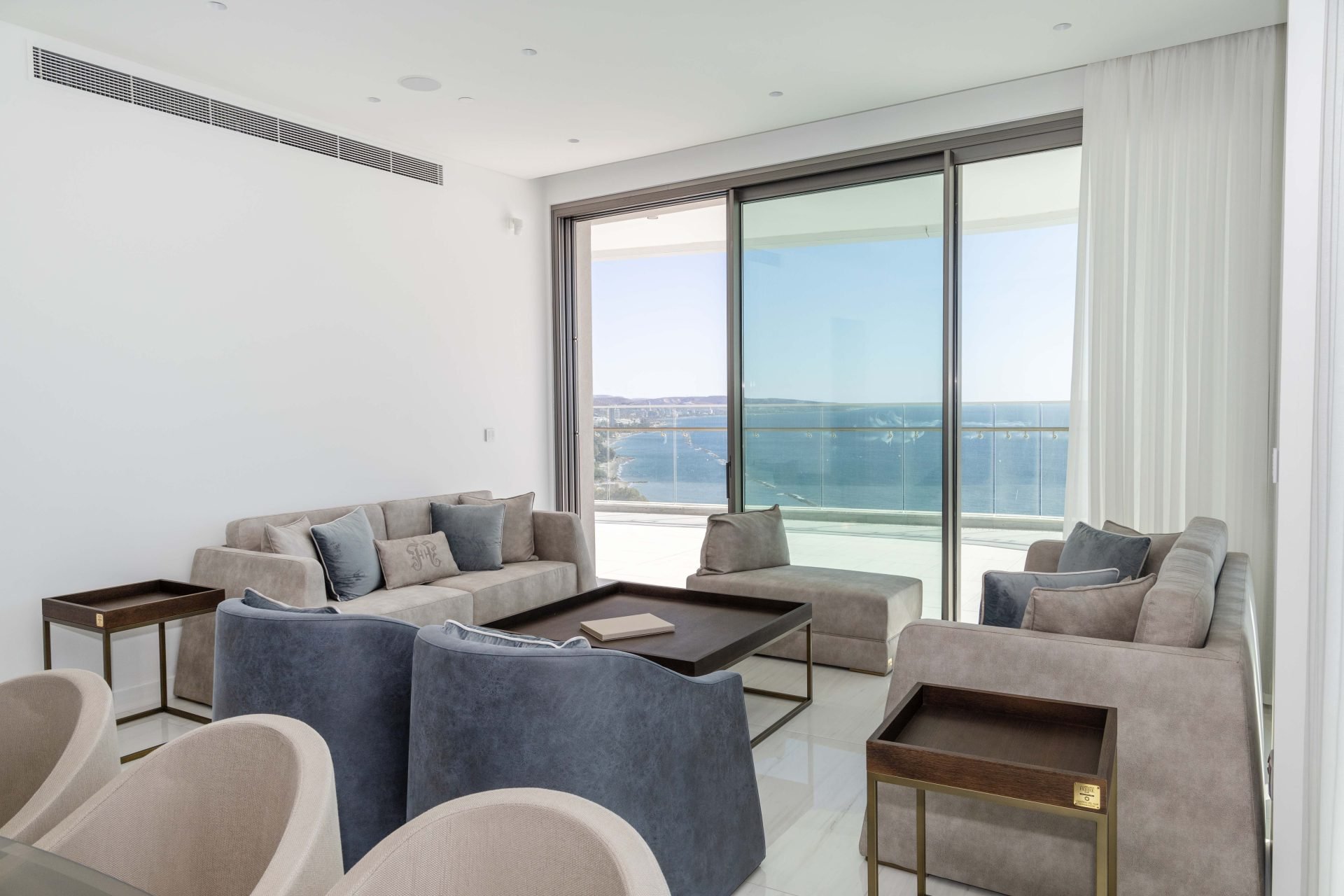 is a Seafront penthouse that enjoys breathtaking views of the Mediterranean Sea at every angle. Being part of Limassol Del Mar, it expresses the island’s ‘new wave’ of architecture through its unique high-rise curvilinear design, which fully capitalises on the plot’s 170 metres long sea frontage.