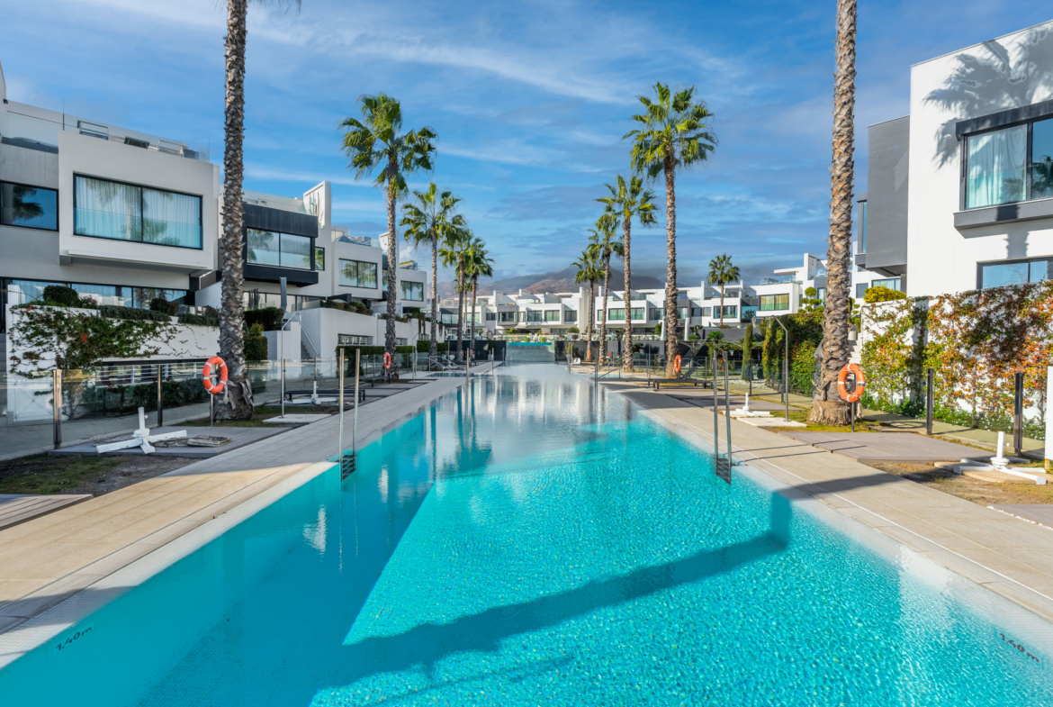 Wenn Sie von modernem Luxus am Meer träumen, ist dieses exklusive Reihenhaus zum Verkauf in Estepona Ihre Chance! Es befindet sich in einem innovativen Strandkomplex mit zeitgenössischem architektonischem Design in einer der begehrtesten Gegenden der Costa del Sol und bietet eine ruhige Strandlage, Privatsphäre, eine grüne Umgebung und modernste Annehmlichkeiten. Sie liegt in der Nähe aller Annehmlichkeiten der Küstenorte Estepona und Marbella. Eine Reihe von Supermärkten und Geschäften, internationale Schulen, Restaurants und Bars, Strandclubs, Golfplätze und eine Vielzahl von Dienstleistungen der lebhaften Neuen Goldenen Meile und des glamourösen Puerto Banus sind nur wenige Autominuten entfernt.